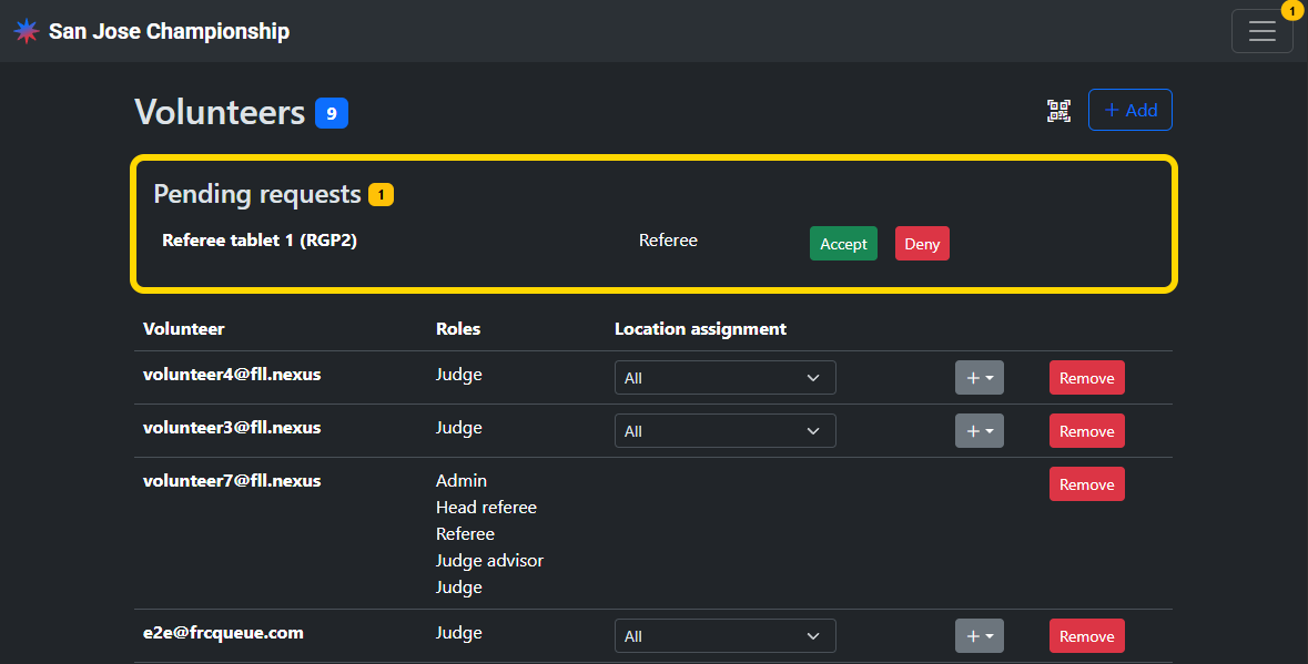 Any existing volunteer who has one of the Admin, Judge advisor, or Head referee roles can onboard other volunteers.