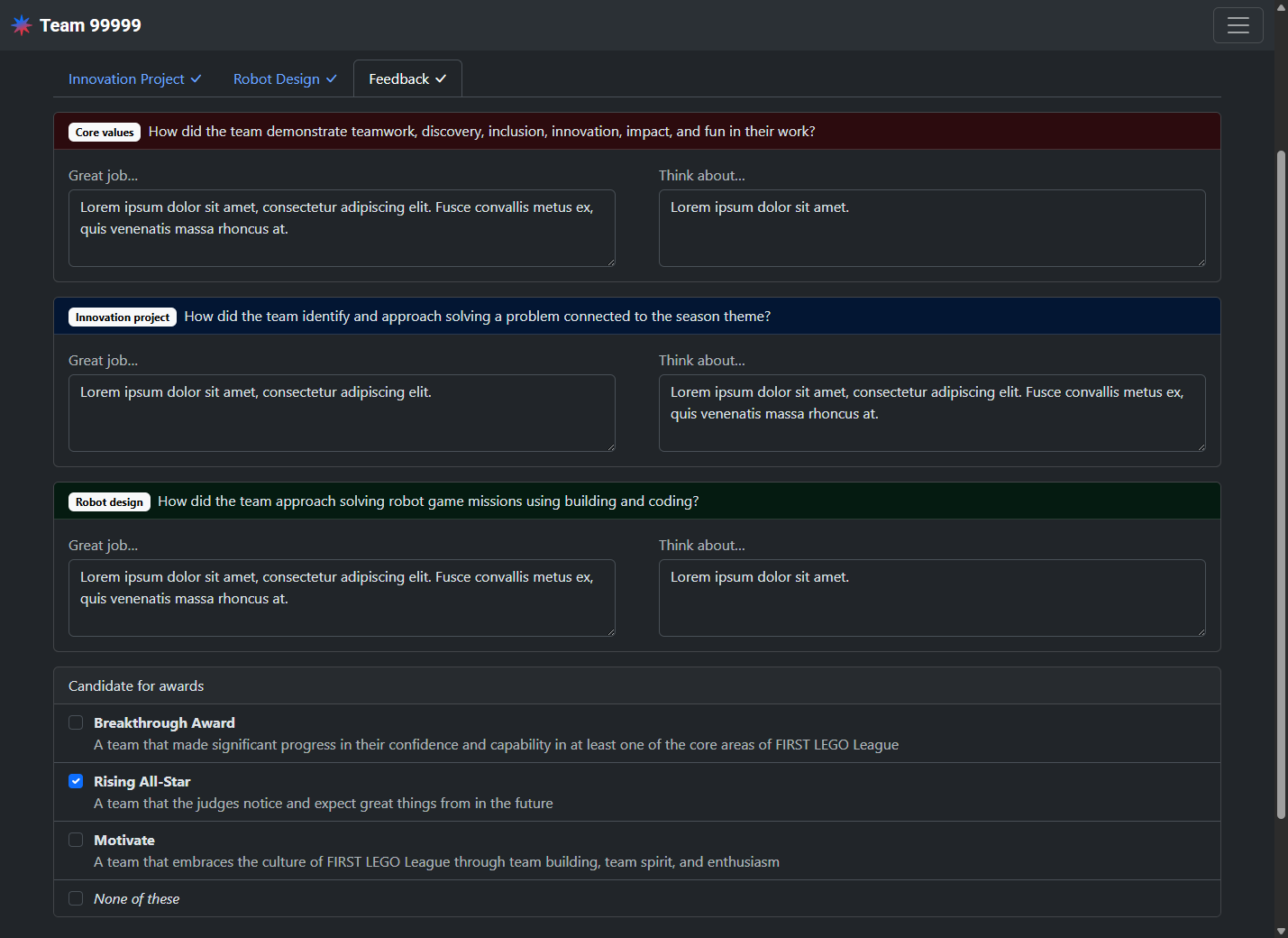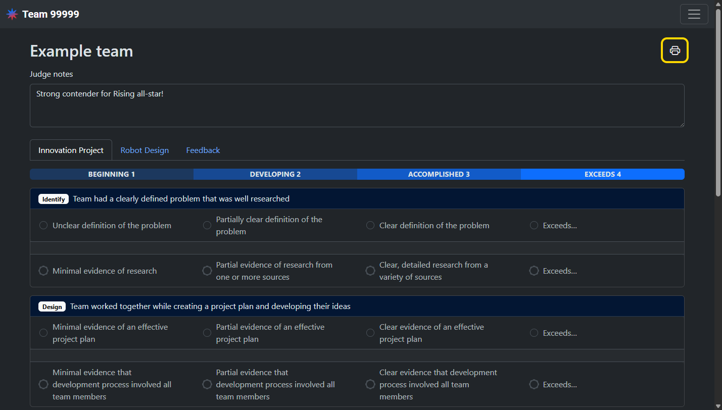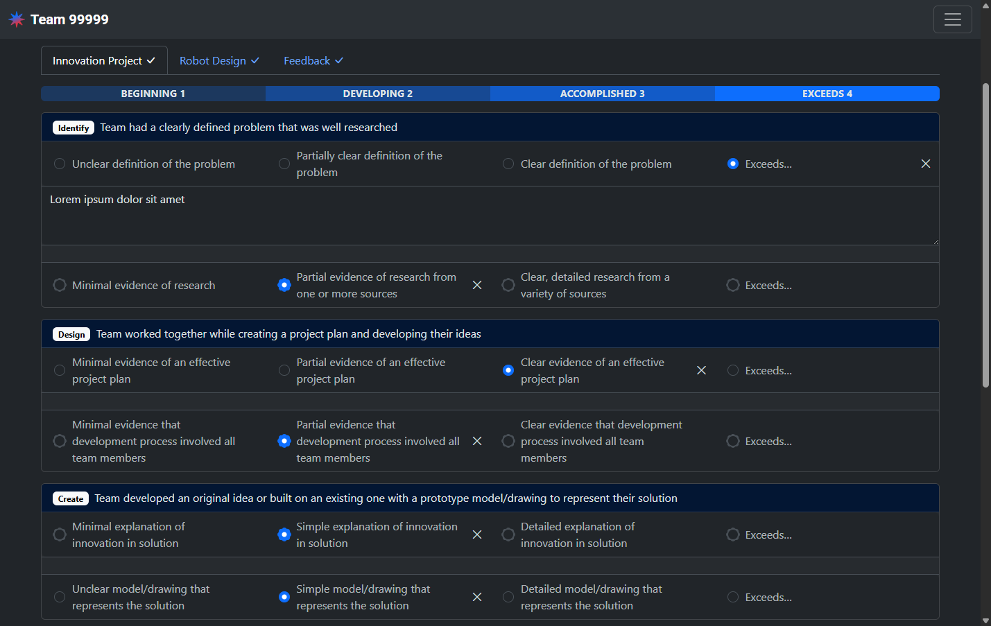 Judges can fill out and submit rubrics in Nexus. Completed rubrics can be published to teams after the event.