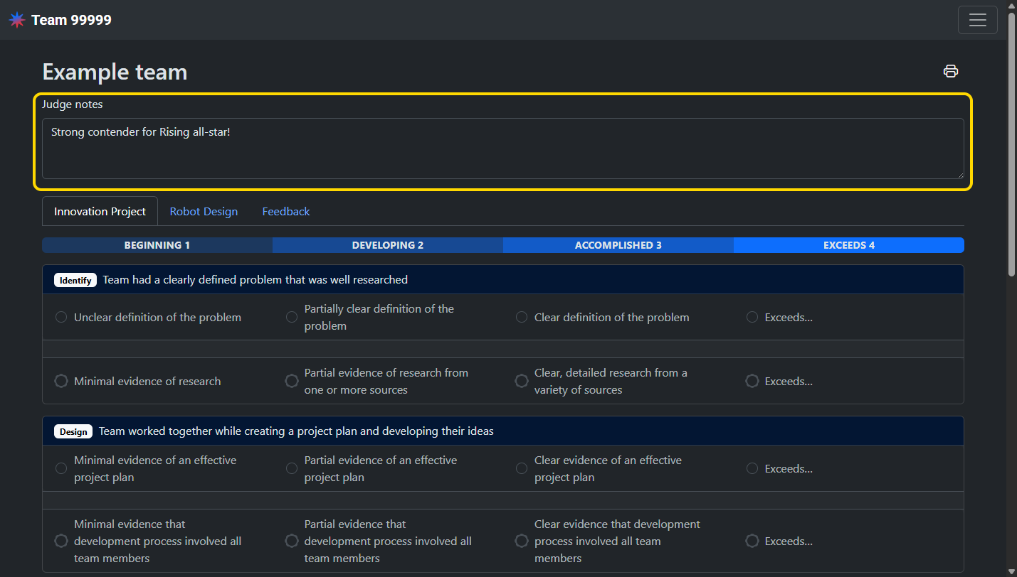 Enter notes in the Judge notes field. These notes will be viewable by all Judges and will not be published to teams.
