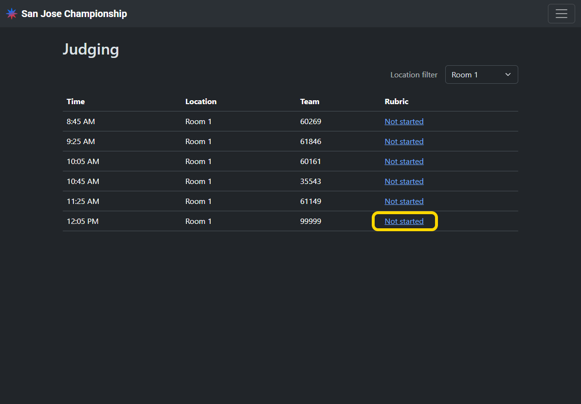 From the judging sessions list, select the row of the team that you want to view. By default, this list is filtered to your assigned room.