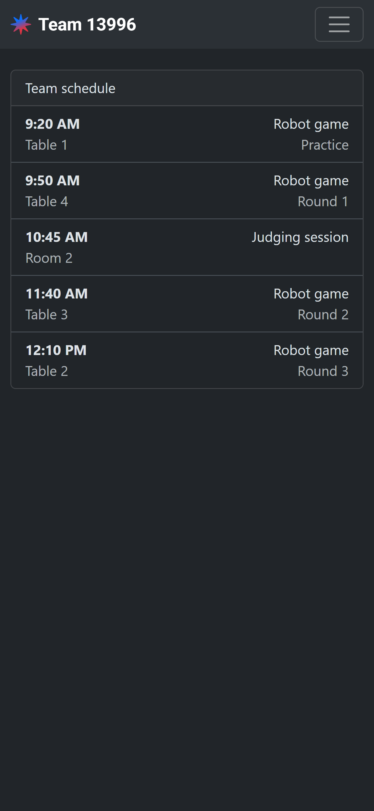 Tap the generate button and input the parameters for the schedule including start time, lunch break time, number of rounds per team, whether there should be a practice round and minimum time between activities. A schedule will be generated based on the configuration. If a judging schedule exists, then teams will not be scheduled matches that conflict with their judging session.